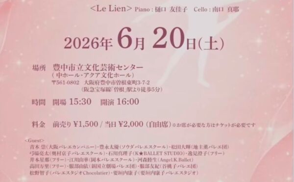 「ISA BALLET SCHOOL Performance」 日時:2026年6月20日(土)会場:豊中市文化芸術センター(中ホール・アクア文化ホール)時間:15:30開場 16:00開演 Part3〈Specialコ […]